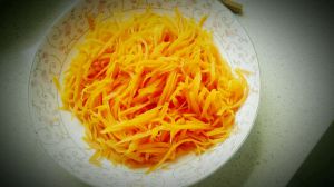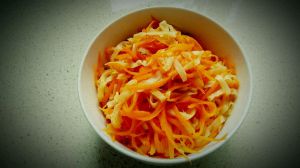放花生油热锅。加入胡萝卜丝。翻炒后加入泡散的面条一起炒。可以加点点水进去焖一下。这样出来面条比较软。不会太干。等水收干后加入适量的盐和酱油。搅拌均匀就可以了。
