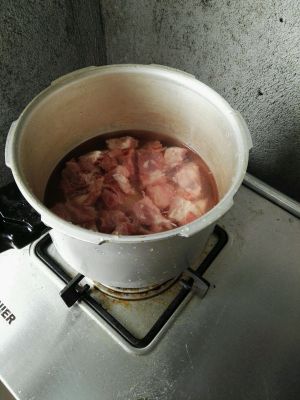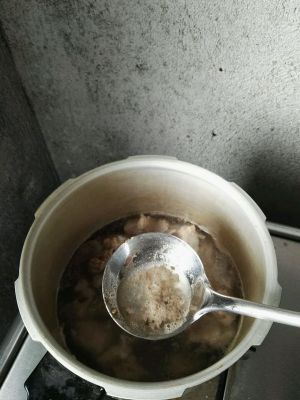 排骨倒入高压锅加水,水浸过排骨多5厘米,开大火