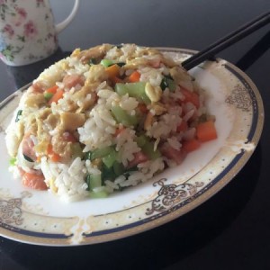 打一个鸡蛋,蔬菜和香肠分别切好装盘备用,米饭盛好备用