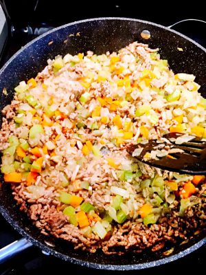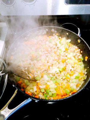 熱鍋 倒入少量橄欖油 油熱了之後倒入蔬菜丁翻炒 要不停的翻炒 蔬菜的水分會流出來 記住一定要把水份全部炒出才可以出鍋