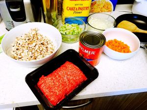 備好食材 蔬菜全部切丁 有機器的可以用機器打碎 這圖不全 見諒 ps:牛肉麋用水泡久些 把血水都泡出去 不然就只能先煮沸把血污移除
