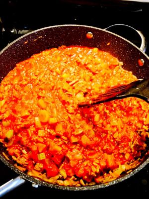 倒入一杯的牛奶 加水也可以 根據喜愛口味加番茄醬 鹽巴 糖 胡椒粉 攪拌均勻 蓋上鍋蓋轉小火慢慢的燉兩個小時 其實可以不用那麼久 但是久一點味道更讚
