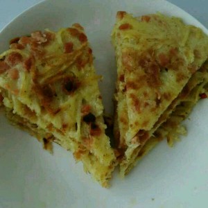 土豆擦成丝,放入胡萝卜碎,鸡蛋,盐,黑胡椒,少量面粉