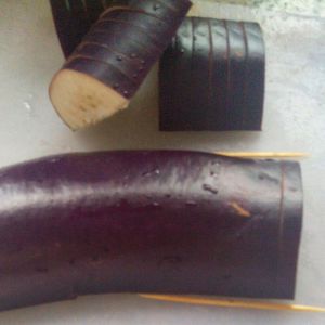 茄子洗净切两半,用两根牙签放在茄子两旁,横切2-3毫米,六段切断。