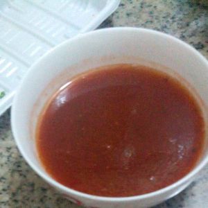 茄汁调料,厨邦番茄酱三汤匙,白糖一汤匙,玉米淀粉一汤匙,蒸肉米粉半汤匙,酱油鸡粉各放一点提味,小半碗清水搅拌均匀,再下锅煮成浓茄汁备用。