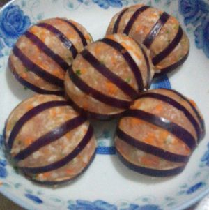 把肉馅塞入茄段里,摆盘上锅蒸十三分钟