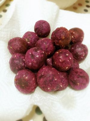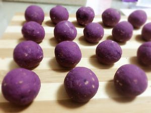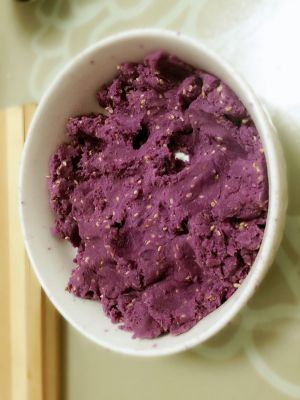 紫薯上锅蒸熟,去皮,加熟芝麻,淀粉拌匀