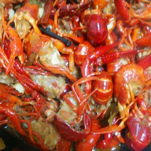 葱,姜,豆瓣酱的味炒至融合!油温升高时倒入龙虾,翻炒,多炒一会,炒至龙虾的腥味不那么浓烈时加入料酒!翻炒几下!
