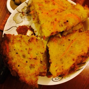 很简单 1.洋芋胡萝卜(可不要 我还放了葱末 会更香)莫成丝 2.加适量水泡在碗里,以免洋芋变色 备用,3.加面粉、黑胡椒、盐、鸡精 ,有喜爱咖喱的可放少许。(均匀搅拌 成糊状)
