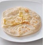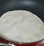 擀面杖擀至0.5cm厚的皮。擀时会发现有气泡,力道要轻,最好不要擀破。锅里热油,放入擀好的面片,中小火,烙至有很多小泡鼓起来。翻面。