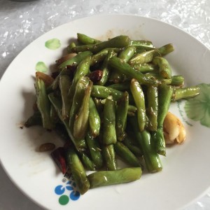 炒至变色后调入鸡精、盐、十三香,四季豆皮起皱后装盘出锅。
