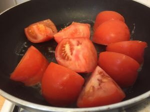油热且融化后,放入切好的柿子块儿。小火慢慢煎着,3-5分钟柿子开始变软,用铲子轻轻刮柿子皮,即可把柿子皮剥下来,扔掉。继续煎,中途用铲子挤压柿子是汁液流出。