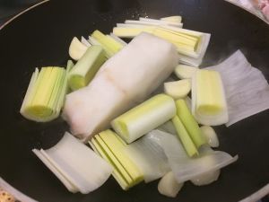 热锅,热油(我用的橄榄油),下葱蒜和鱼块儿。撒入一些盐和胡椒粉。