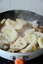 翻炒均匀后,放入莲藕片,翻炒断生