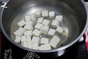 豆腐放进冷水锅中,加1小勺盐慢火煮开后捞出;(用盐水煮一下豆腐,可以去除豆腥味,同时等会煮的时候没那么容易煮烂)