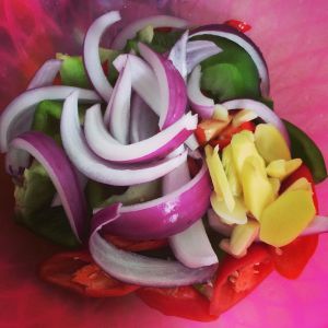 在水里剥洋葱切片,青椒切块,红椒切块,小红椒切块,蒜头切片,姜切片
