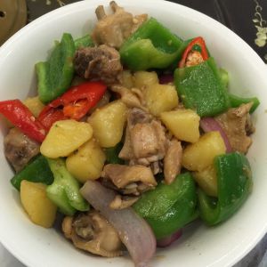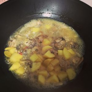 热油爆小红椒蒜姜,加些红油翻炒,再加入鸡肉炒出焦黄色,再加入土豆和水