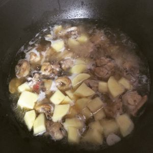 加入八角粉生抽和冰糖调味,盖锅盖转小火焖15分钟,土豆变软汤汁变浓