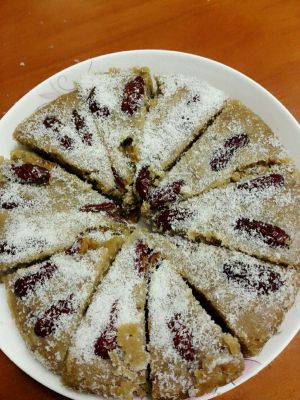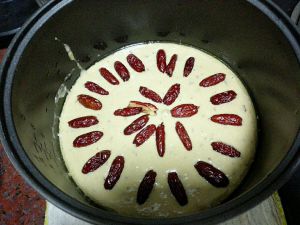 把搅好的面糊加入碎红枣再继续搅,静置半小时后在表面铺一层红枣