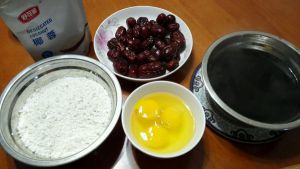 准备好材料,黑糖切碎加水煮成黑糖浆。先把红枣煮10分钟再脱核切碎.把鸡蛋、椰汁、黑糖浆和进低筯面粉,一边搅一边加椰汁和椰丝