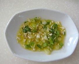 盘内放2汤匙橄榄油,放入葱姜蒜末。