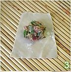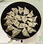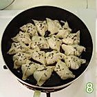 馄饨坯上沾上少许淀粉水,沾上适量的黑芝麻。锅内做油,小火,将馄饨坯依次放入,保持小火煎约一分钟