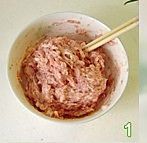 在猪肉末中加入姜末、鸡蛋,盐、糖、鸡精、香油用筷子顺一个方向搅拌,至肉末粘稠上劲