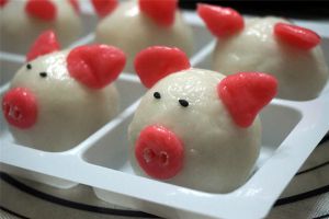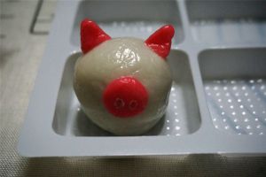 另外取两粒红面团,捏成三角形装,黏在顶部形成猪耳朵。