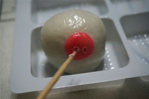 然后取少许红色面团,揉圆,压扁后粘到主体的正前方,并用牙签按出两个小鼻孔。
