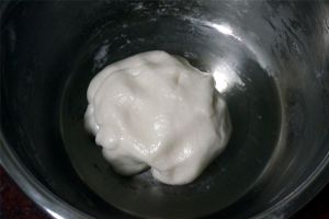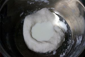 将冰皮粉放入大盆里,加入纯净水,揉成面团。