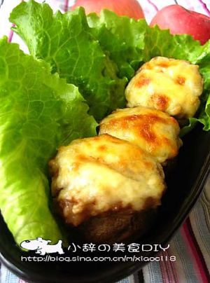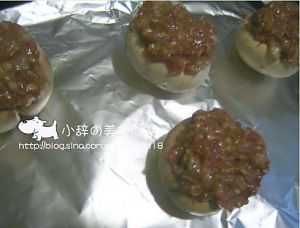将肉酱填入蘑菇肚内,用刀把肉酱抹平,上面撒上芝士
