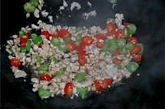 净锅上油,待油热后,下姜末炒香,倒入肉丁翻炒。下少许,酱油,醋,料酒。倒入青红椒丁。