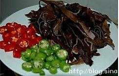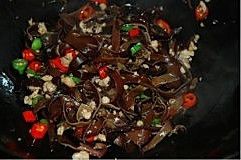 下入沥干水的木耳丝翻炒均匀,加盐,鸡精调味后起锅。