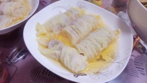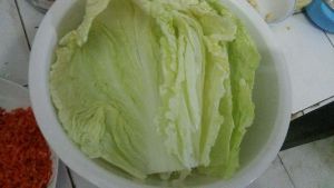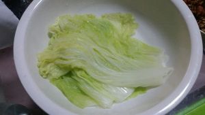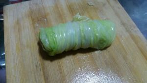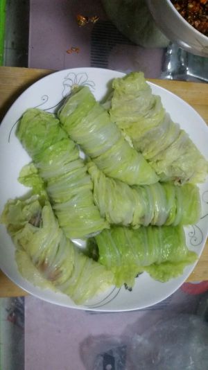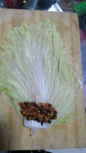 白菜要内芯,去掉帮,放容器里用开水烫软