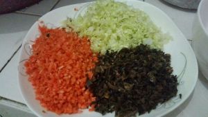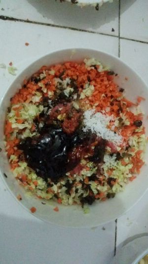 木耳胡萝卜白菜碎肉掺一起,加入耗油、味极鲜、盐、糖拌匀