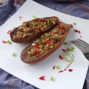 从烤箱里取出整盘的茄子,解开面上的锡纸,再用勺子把炒锅里的酱料均匀的分成12等份,方便铺在每个茄子上;