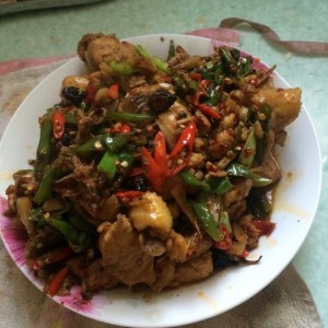 油温冒烟,找下草果八角,炒出香味在放姜、大蒜、青辣椒翻炒几次之后倒入鸡肉大火翻炒,翻炒10分钟左右加入酱油、朝天辣、花椒、盐半勺,味精半勺,继续翻炒一分钟。