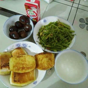搭配上白米粥,坚果板栗,蔬菜,牛奶,是丰盛的,营养均衡的早餐。