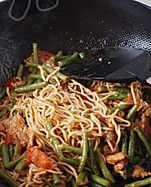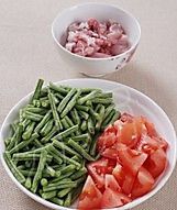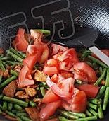 豆角切段,番茄去皮切块,肉切片,大蒜切碎。锅里热油,葱姜爆香后放入肉迅速滑炒几下加入老抽和生抽翻炒均匀。