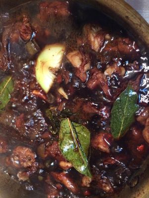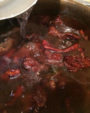红酒变得粘稠后加入清水,这次完全淹没肉块。