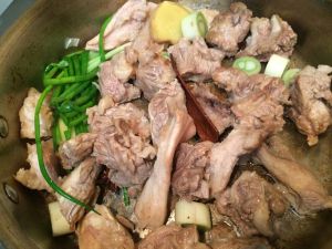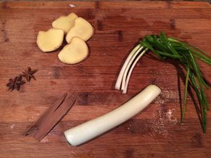 准备香料,小葱打结拍松、大葱切段。