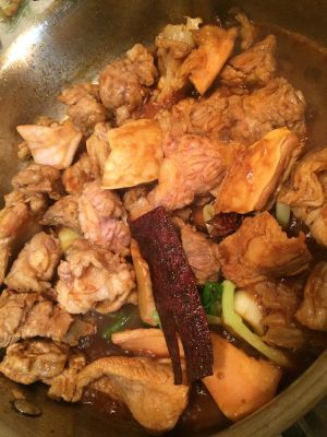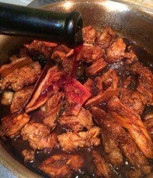 老抽让肉块挂色以后倒入红葡萄酒,量要将将淹没肉块。