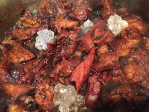 汤汁收掉1/3时加入冰糖,冰糖的量可以稍微多些,一来中和红酒酸味,二来让暗色的肉块显得明亮,