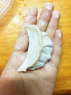 然后准备一晚温水「冬天就用温水好点」用手指沾水包饺子,我买的饺子皮,所以需要温水或蛋清涂抹才能包紧。