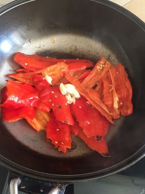 这时加入蒜.豆豉和油,继续煎制