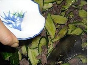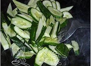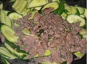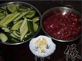 牛肉逆纹切薄片,用生粉、油、盐拌匀,腌20分钟;黄瓜清洗干净,切片;蒜头切片;