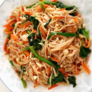 捞出胡萝卜后倒入金针菇,汆1分钟后捞出(时间长了会老的嚼不烂),晾凉后用手挤出水份
