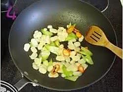 锅烧若热加入少许油,放入红甜椒、西芹、马蹄翻炒片刻;