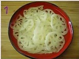 适量水烧开,放入藕片汆烫1分钟左右,捞起冲凉水并沥干备用;