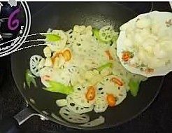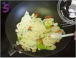 倒入沥干水份的藕片,快速翻炒片刻,加入适量盐调味;
